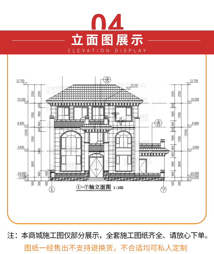 购买本套图纸仅提供打印好的图纸一份,我们不出售电子文件、光盘。我们设计的图纸非常详细,用A3规格打印图纸,比传统蓝图更清晰、容易复印、方便收藏,可以直接应用到施工现场。售后服务仅为图纸答疑,不包任何修改,因为只要其中一张图纸改变,其它图纸相应均需修改,工作量较大,所以我们不包修改。如果您个性要求较多需按要求订做设计,请查看 别墅设计业务流程,并联系设计客服咨询设计收费标准。