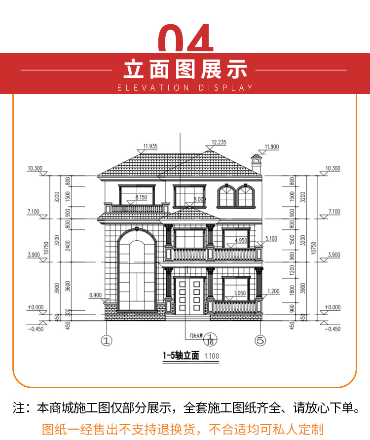 购买本套图纸仅提供打印好的图纸一份,我们不出售电子文件、光盘。我们设计的图纸非常详细,用A3规格打印图纸,比传统蓝图更清晰、容易复印、方便收藏,可以直接应用到施工现场。售后服务仅为图纸答疑,不包任何修改,因为只要其中一张图纸改变,其它图纸相应均需修改,工作量较大,所以我们不包修改。如果您个性要求较多需按要求订做设计,请查看 别墅设计业务流程,并联系设计客服咨询设计收费标准。