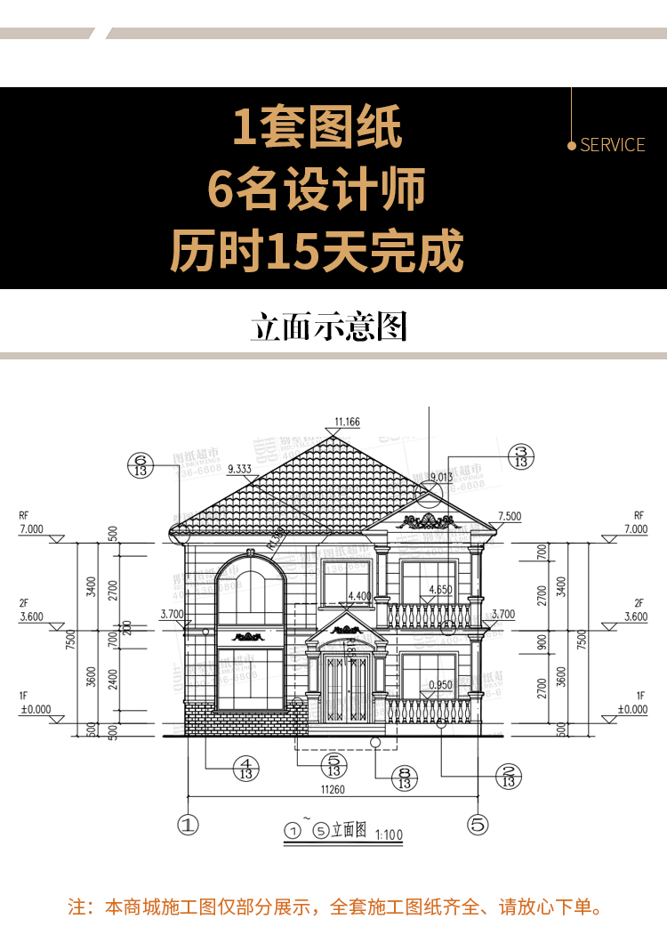 购买本套图纸仅提供打印好的图纸一份,我们不出售电子文件、光盘。我们设计的图纸非常详细,用A3规格打印图纸,比传统蓝图更清晰、容易复印、方便收藏,可以直接应用到施工现场。售后服务仅为图纸答疑,不包任何修改,因为只要其中一张图纸改变,其它图纸相应均需修改,工作量较大,所以我们不包修改。如果您个性要求较多需按要求订做设计,请查看 别墅设计业务流程,并联系设计客服咨询设计收费标准。