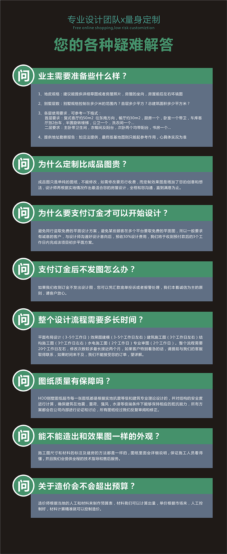 购买本套图纸仅提供打印好的图纸一份,我们不出售电子文件、光盘。我们设计的图纸非常详细,用A3规格打印图纸,比传统蓝图更清晰、容易复印、方便收藏,可以直接应用到施工现场。售后服务仅为图纸答疑,不包任何修改,因为只要其中一张图纸改变,其它图纸相应均需修改,工作量较大,所以我们不包修改。如果您个性要求较多需按要求订做设计,请查看 别墅设计业务流程,并联系设计客服咨询设计收费标准。